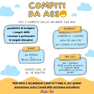Da martedì 2 luglio e fino alla fine di agosto (esclusa la settimana di Ferragosto) ogni martedì e ogni giovedì dalle 9:00 alle 11:00 a Berzo Inferiore è attivo il progetto COMPITI DA ASSO! dedicato ai bambini che hanno frequentato la scuola primaria e secondaria di primo grado nell’anno scolastico appena terminato e che devono svolgere i compiti delle vacanze.